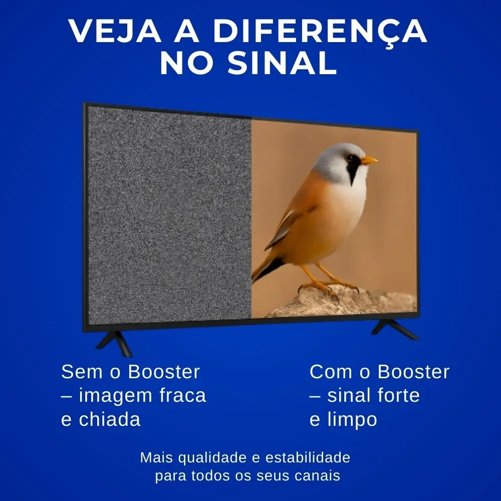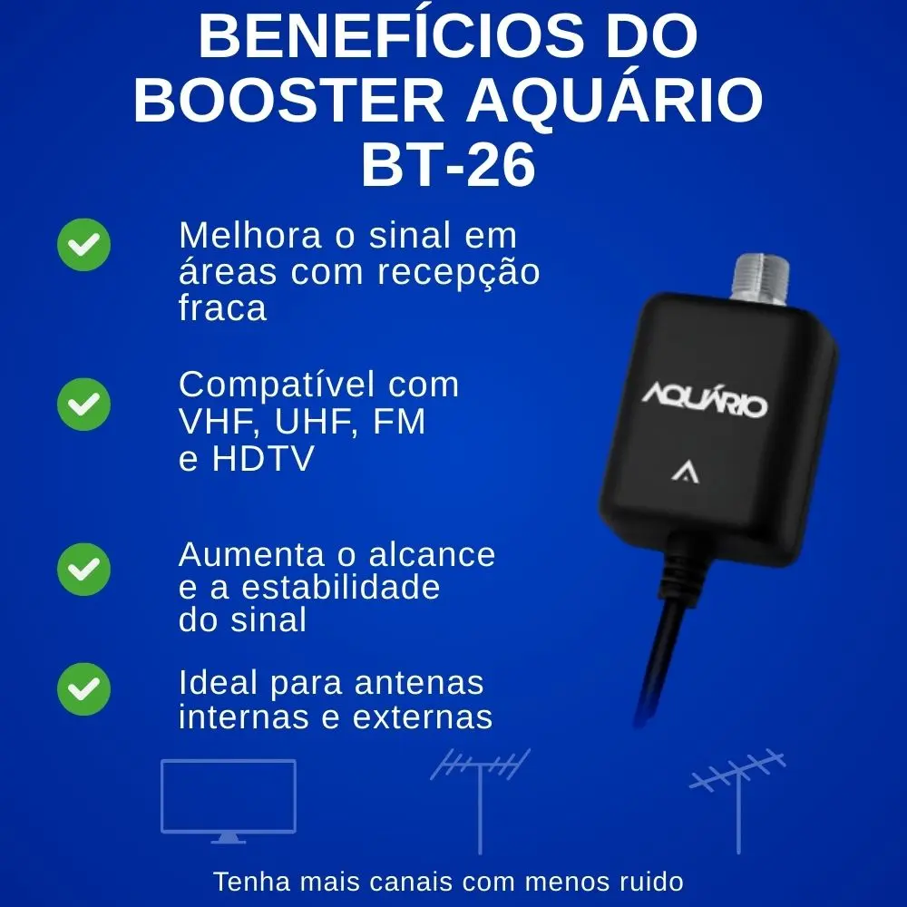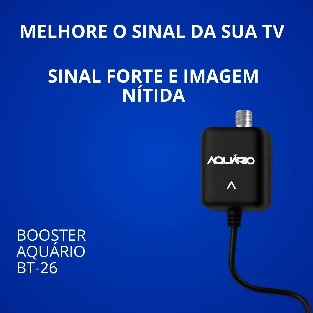 Melhore a qualidade da sua recepção de TV com o booster Aquário! Ideal para áreas com sinal fraco, ele aumenta o alcance e a estabilidade, garantindo imagem nítida e som limpo em todos os seus canais.